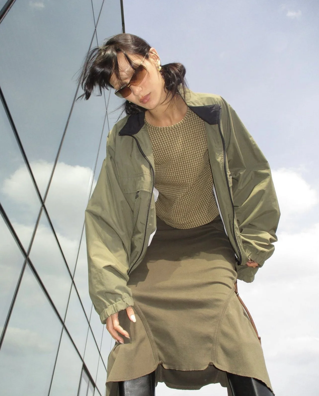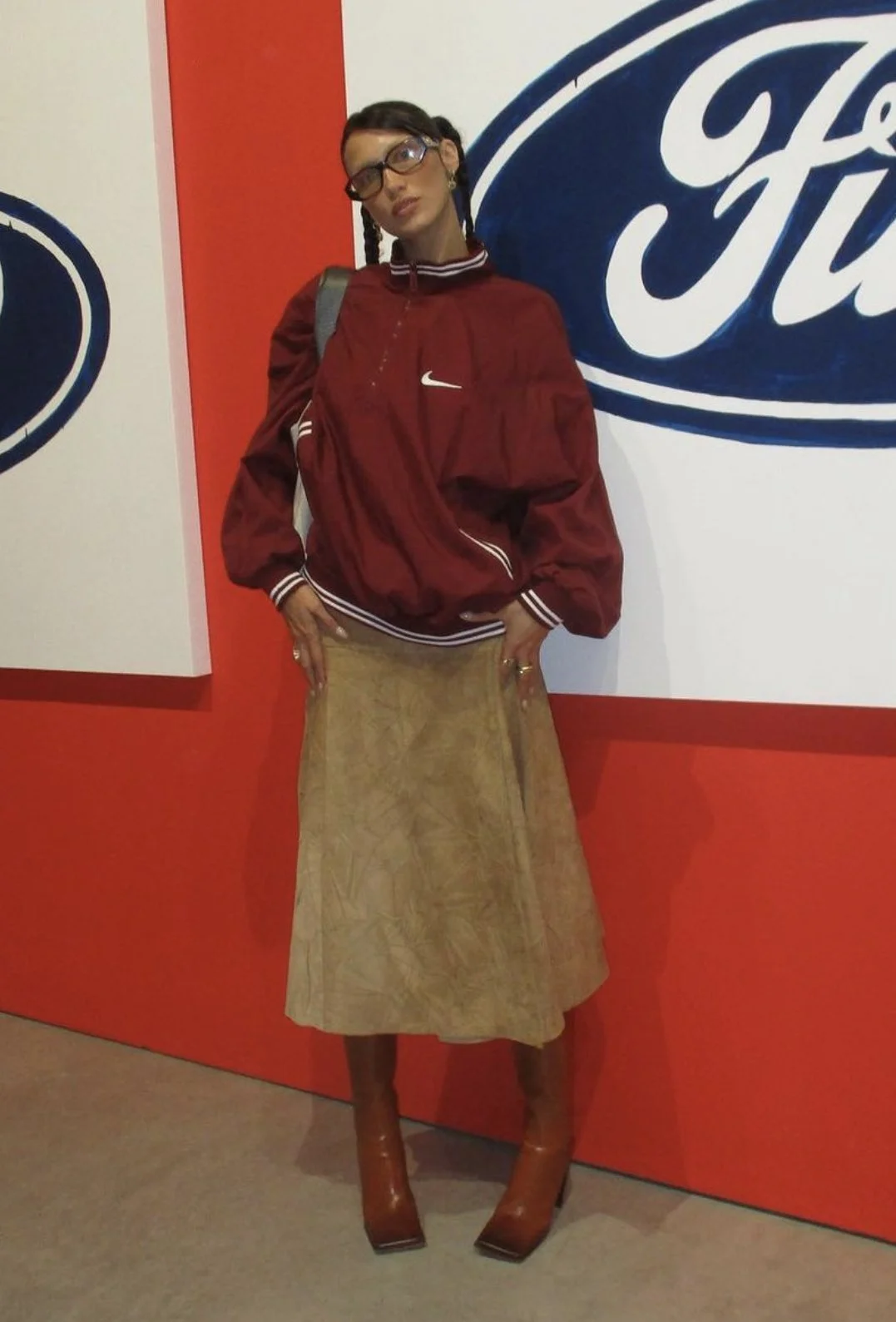 Get the Bella look by studying some of her more iconic street wear looks such as the one above. In this she is seen wearing a very cool, fashionable outfit that matches in colors and shapes. A big thing in style is matching things based on shades, different colors, and the silhouette you want to make. In this she wears all matching shades of green, making it a cool monochromatic look. She also wears a bomber jacket and a long skirt. The reason this matches is that they both have the sort of baggy feel like makes outfits look so unique and trendy. She also styled them with brown lensed glasses, pairing nicely with the colors she’s already wearing , and a black boot. All of these match perfectly with these earthy tones she’s going for, making it stylish and eye catching.